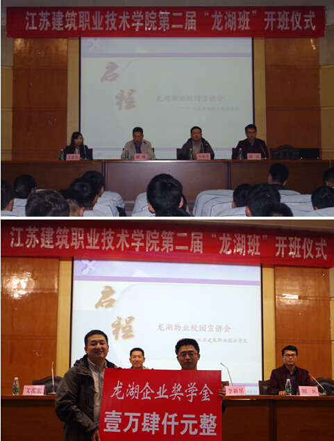 10月15日晚,第二届“龙湖班”及企业奖学金发放仪式在校学术报告厅隆重举行,这是机电学院与杭州龙湖物业公司开展深度校企合作的又一成果。机电工程学院党总支书记潘峰、杭州龙湖物业公司人力资源部经理李新星、杭州龙湖物业公司招聘专员艾泓宏、机电工程学院辅导员胡兵出席开班和颁奖仪式。龙湖班33名学员及大二、大三部分专业的学生参加了大会。