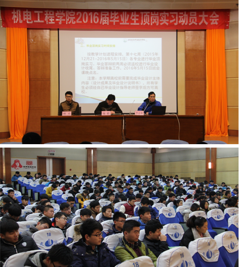 为确保2016届毕业生顶岗实习的顺利进行,2015年11月26日上午,机电工程学院在学术报告厅隆重召开2016届毕业生顶岗实习动员大会。机电工程学院副院长李志球、党总支副书记鹿毅出席会议,就业工作辅导员和全体毕业生参加了大会。