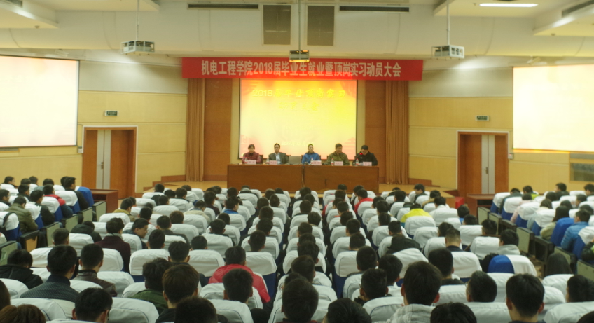 为确保我院2018届毕业生就业和顶岗实习的顺利进行,2017年12月3日晚上,机电工程学院在学术报告厅隆重召开2018届毕业生就业暨顶岗实习动员大会。机电工程学院党总支书记潘峰、机电工程学院院长仇文宁、机电工程学院副院长李志球、机电工程学院副院长赵武出席会议,参加大会的还有毕业班班主任、就业辅导员和全体2018届毕业生。