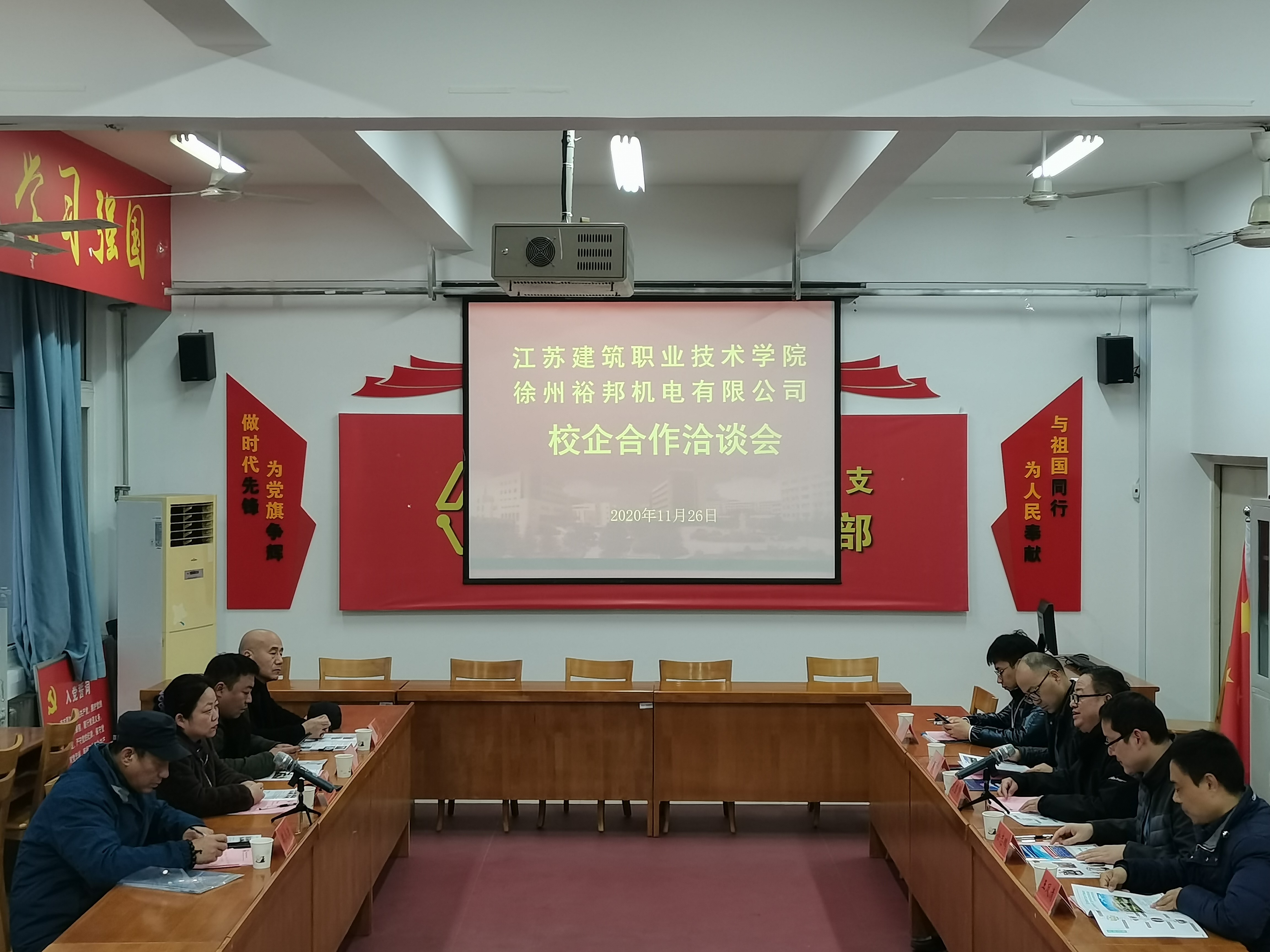 2020年11月26日,在第一实训楼必赢76net线路学生工作会议室,徐州裕邦机电有限公司和必赢76net线路举行了校企合作洽谈。徐州裕邦机电有限公司总经理曹询、业务经理胡宁、人力资源部主任魏成法和必赢76net线路党总支书记刘盛贤、江苏建筑职业学院教务处副处长徐志鹏、中国矿业大学教授谢方伟、必赢76net线路党总支副书记王凤清出席会议,就业办主任林磊参加了会议,会议由党总支副书记王凤清主持。